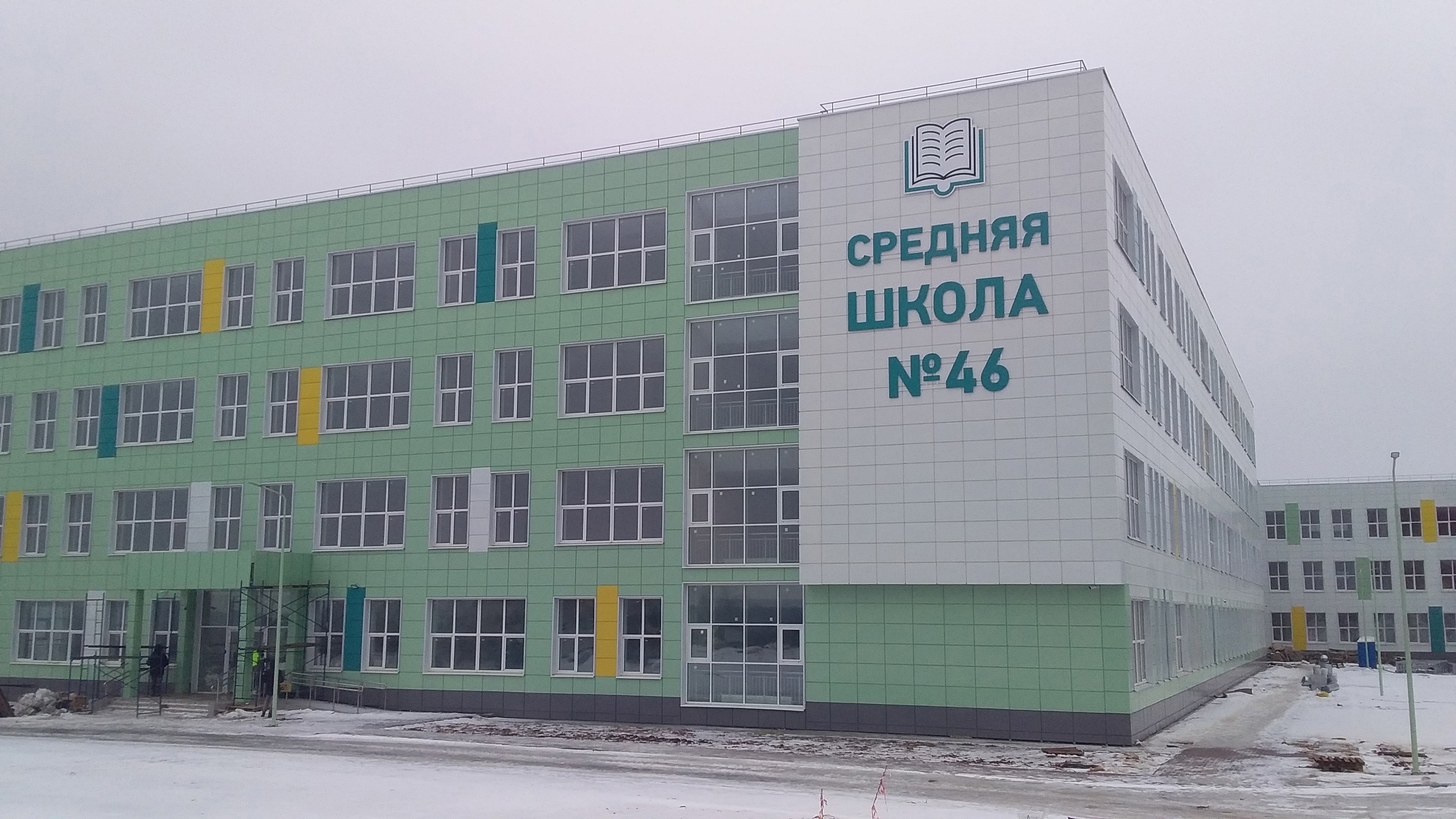 На фасад здания уже нанесли надпись: «Средняя школа №46». Как и с предыдущими новыми школами, это будет не отдельное учреждение, а отдельный корпус расположенной по соседству 46-й.