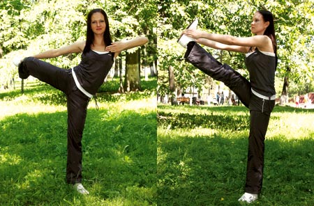 Попробуйте, сохранив прямое положение спины, взять ногу за ступню и вытянуть вперед. Также, сохраняя выворотное положение бедра, отвести ногу с согнутым коленом за себя.