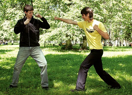 Перенесите массу тела на правую ногу. Сильно оттолкнитесь ею от пола, одновременно вынося правую руку к цели и вращая туловищем ( левое плечо резко разворачивается назад ): правая стопа — правый тазобедренный сустав — правое плечо. Рука движется по прямой к воображаемой цели.