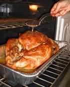 Индейка — чемпион. Она выиграла в продолжительной рождественской борьбе с гусем и уткой за счет массы тела. Она экономичнее. Возможно, в ущерб вкусу — но вкусы у всех разные. Индейка на самом деле может получиться вкусной. Для этого хозяйка должна пожертвовать собой и постоянно ее поливать. Учитывая, что индейка жарится полдня, это настоящий героизм. Хотя можно поступить и по-другому. Если у вас есть корыто, налейте в него 8 литров воды, насыпьте 2 стакана крупной соли и стакан сахара. Когда они растворятся, добавьте каких-нибудь сушеных пряностей: лавровый лист, тимьян или что там у вас есть.