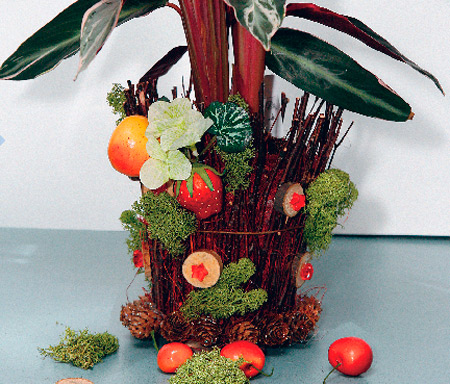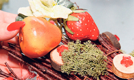 Декорируем спилы украшениями. Добавляем главный декоративный элемент — композицию из муляжей фруктов.