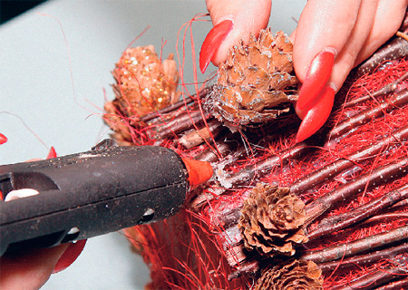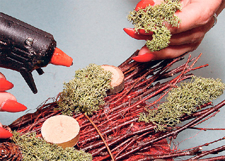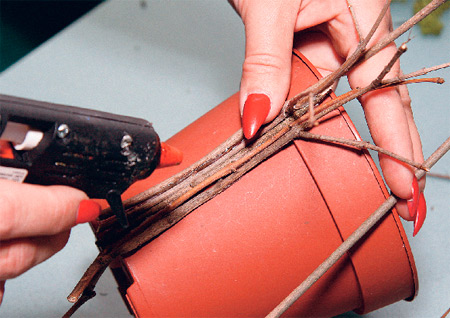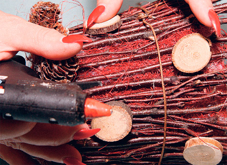 С помощью пистолета приклеиваем веточки. Ножницами выравниваем край. Для большей прочности стягиваем проволокой.