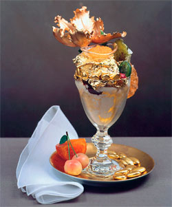 Кстати, не забудьте прихватить посуду для десерта. Сливочное мороженое на 25 сортах какао, украшенное взбитыми сливками, кусочками съедобного золота, а также маленькой шоколадкой от Knipschildt Chocolatier, подается в бокале, украшенном золотой каймой и алмазами, и с золотой ложечкой. Очень сладкий десерт. Особенно если учесть, что стоимость одной порции — 25 тысяч долларов.