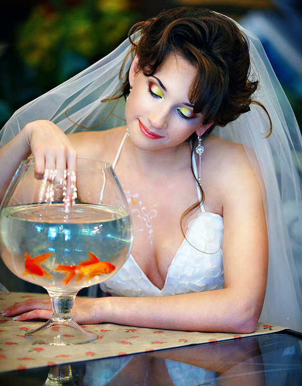 Перед тем как начать работу, я долго разговариваю с каждой парой и всякий раз придумываю что-то новое. Например, недавно увидела девушку с золотыми рыбками. Так на свадьбе появились две рыбки в большом полупрозрачном бокале… Они в тот день были везде - и в интерьерной съемке, и на улице… Безумно красиво получилось… На другой девушке я представила веночек из полевых цветов, для третьей – качели подвешивала…