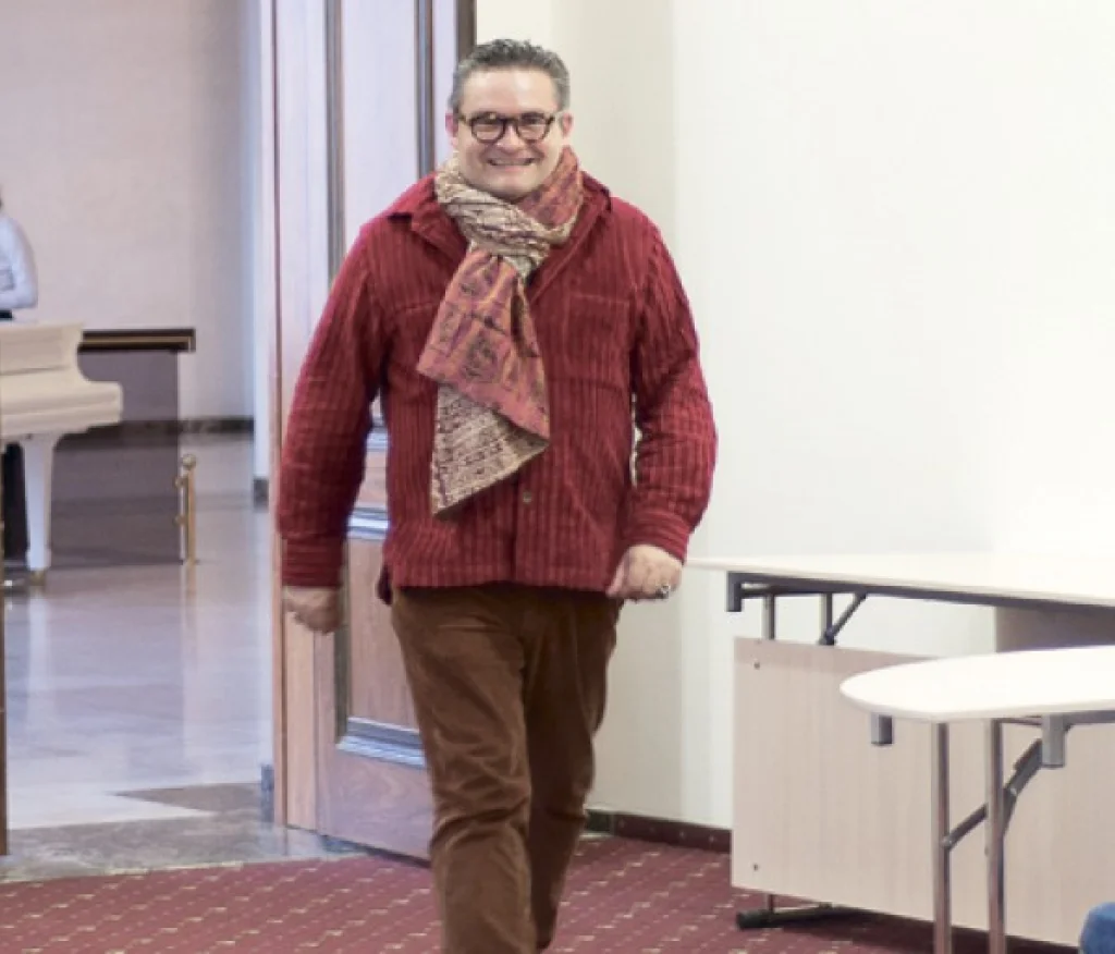 Маэстро был в красном, вокруг шеи — неизменный шарф. В зал, где проходила пресс–конференция, легендарный историк моды буквально впорхнул.