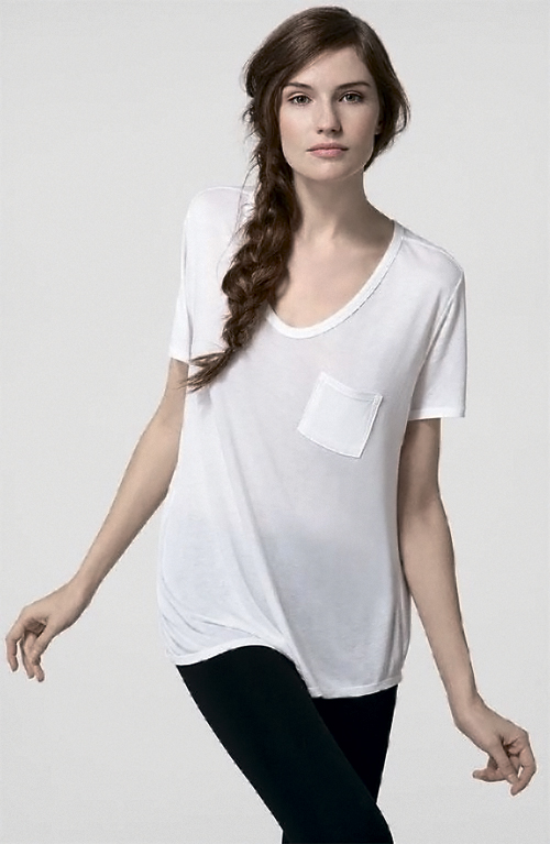 4. Фуфайка (t-shirt) - трикотажная, либо выполненная из ткани, смесовой с шелком, белого или светлого пастельного оттенка, с карманом на груди и У-образным вырезом - будет прекрасной основой любого комплекта в стиле кэжл. В 2009 году изобрел такую, как казалось бы, простую вещь, талантливый молодой дизайнер Alexander Wang. Но, как уже нам известно, совершенно не обязательно гнаться за брендами и мы преспокойненько сможем приобрести подобную фуфаечку в любом другом магазине одежды. Что важно? Важно, чтобы трикотаж был качественным, строчка - идеальной, крой – безукоризненным, а длинна, подходящая нам по росту. Фуфайка должна быть достаточно свободной, скрывать рельефы тела, если таковые имеются, и подчеркивать достоинства фигуры.