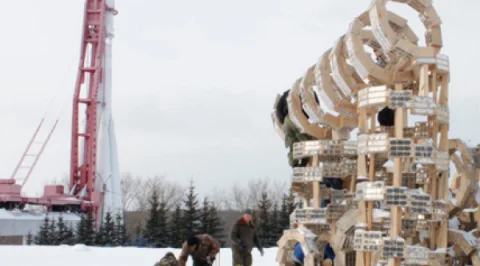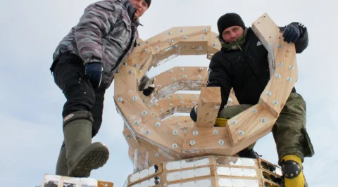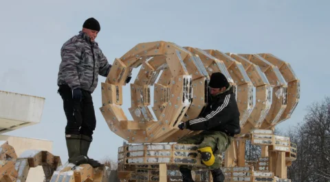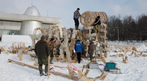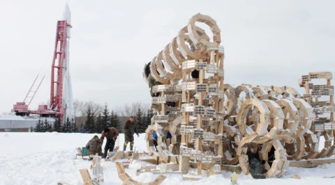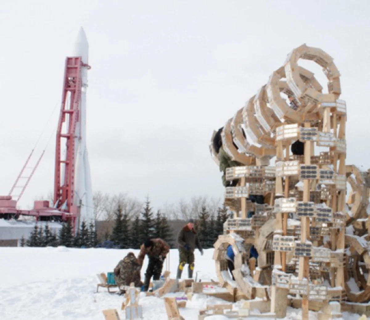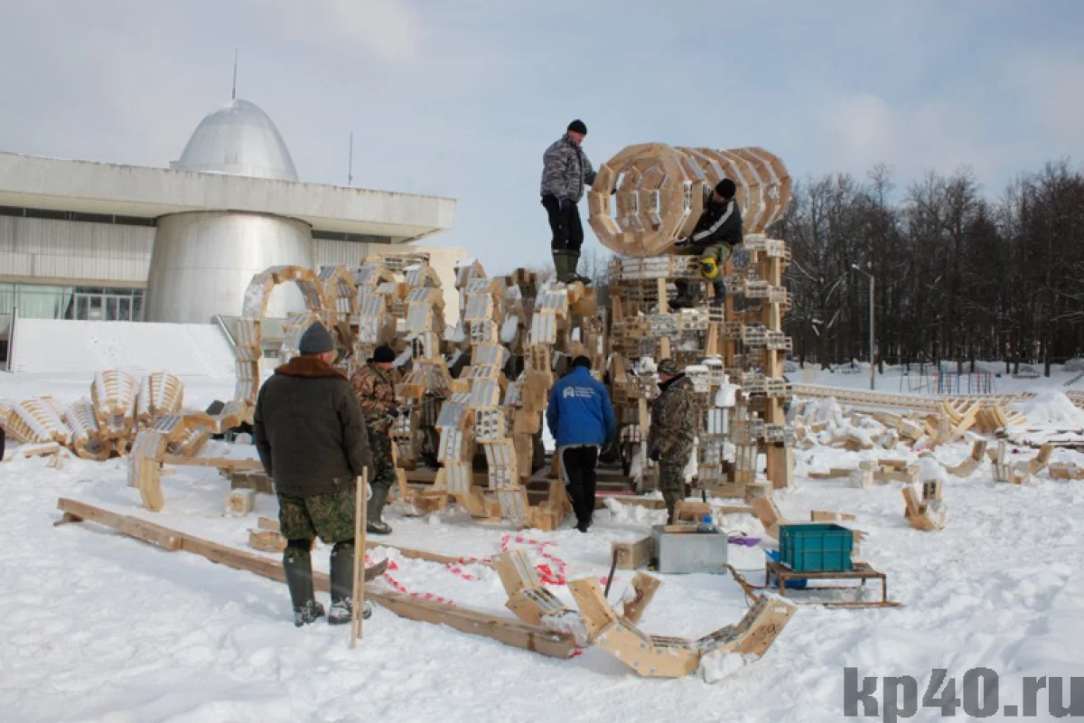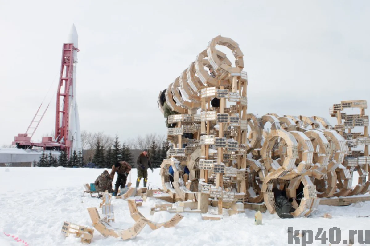 В понедельник, 4 марта, рядом с музеем истории космонавтики в Калуге начали возводить арт-объект из дерева. Конструкцию здесь готовят к приезду вице-премьера Владислава СУРКОВА, который посетит Калугу 15 марта. В этот день пройдет презентация проекта Дворца новой культуры, который собираются построить на месте воинской части рядом с музеем.