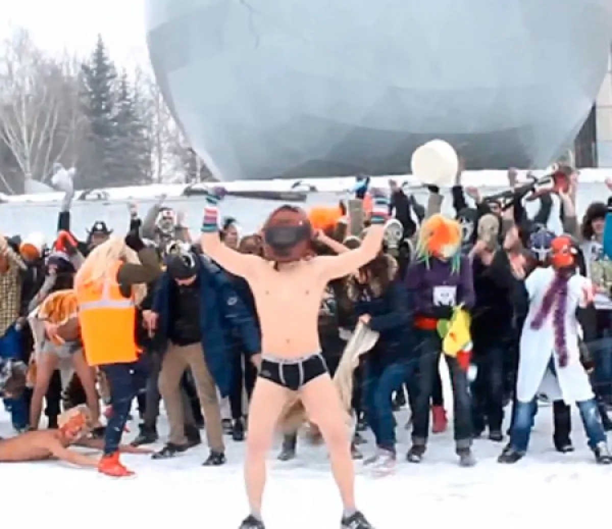 Молодежь не испугали даже мороз и снег – многие раздевались до пояса, чтобы сняться в массовом танце на «шарике». В конце февраля похожим образом отметились в Обнинске.
