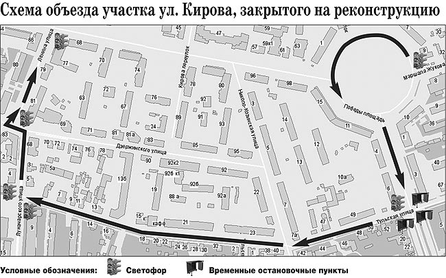 В итоге автовладельцам предложили передвигаться следующим образом: с улицы Маршала Жукова транспорт будет поворачивать на Степана Разина. Оттуда – на улицу Тульскую. Далее — на Луначарского, потом — на улицу Ленина, а оттуда — в центр, на улицу Кирова.