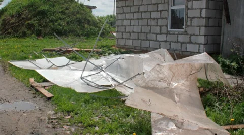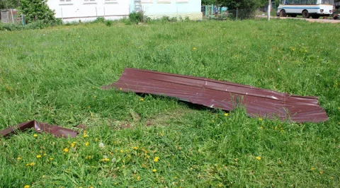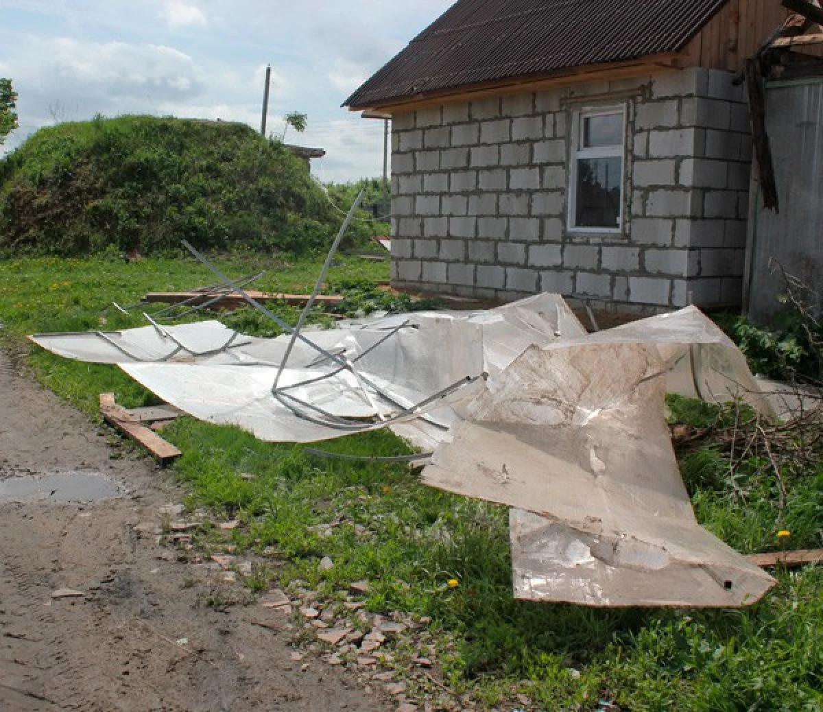 О прошедшем накануне торнадо в Барсуках напоминают раскрытые крыши. Такое чувство, что жители деревни внезапно дружно затеяли ремонт. По всей деревне валяются куски шифера и покореженные листы кровельного железа.