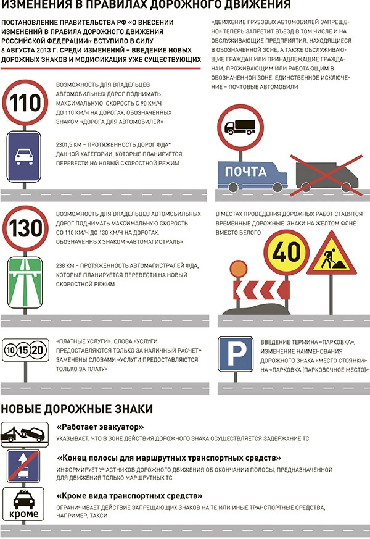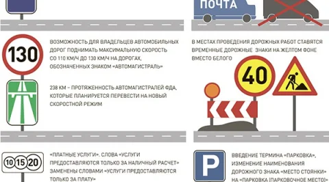 Кроме этого появляются новые дорожные знаки. Временные, которые устанавливают на время ремонта дороги, будут делать на желтом фоне, а не на белом. На некоторых автомагистралях и автомобильных дорогах увеличена скорость до 130 и 110 километров соответственно, но разгоняться так можно будет только в тех местах, где есть специальные знаки. Киевская трасса в список скоростных магистралей пока не входит.