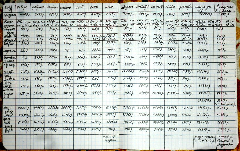 У меня, наверно, как у многих, периодически возникал вопрос: куда деваются деньги, на что они потрачены? Вначале я записывала некоторые расходы, но это было как-то хаотично и не давало полной картины о расходах, допустим, за месяц. Потом я придумала таблицу расходов с учетом конкретно моих затрат. Завела для этого тетрадь, куда и стала заносить ежедневно (или раз в несколько дней) все расходы. Это не значит, что я дотошно записывала каждый потраченный рубль, но старалась фиксировать расходы. Одна тетрадь – один год финансового распределения всех заработанных средств. Я знакома с электронными вариантами ведения всевозможных схем контроля за расходами, распределения семейного бюджета, но мне больше нравится так, по старинке, в бумажном варианте.