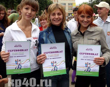 Самый гламурный вид спорта, популярный во всем мире – бег на шпильках – в этом году привлек много участниц, причем самой старшей было 70 лет. Некоторые из калужанок участвовали в нашем традиционном в День города забеге уже второй, и даже третий раз. На шпильках от девяти сантиметров не так-то просто быстро ходить, а уж бегать подавно. Но все участницы добежали до финиша, а первым трем за быстроту и стремление к победе были вручены призы – сертификаты на покупку обуви в магазине «Форум».