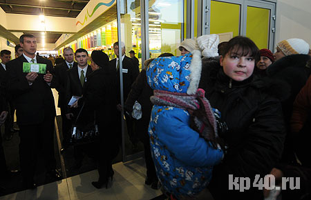 По толпе прокатился ропот. Как выяснилось, официальное открытие планировалось только для узкого круга лиц, но прознавшие о нем калужане никак не хотели мириться и всеми правдами и неправдами пытались убедить охрану, что они очень даже к этому узкому кругу лиц причастны и требовали пропустить в зал. В итоге руководство гипермаркета дало отмашку пустить всех желающих.