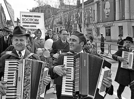 Работники фабрики «Аккорд» ходили на демонстрацию со своей продукцией — аккордеонами.