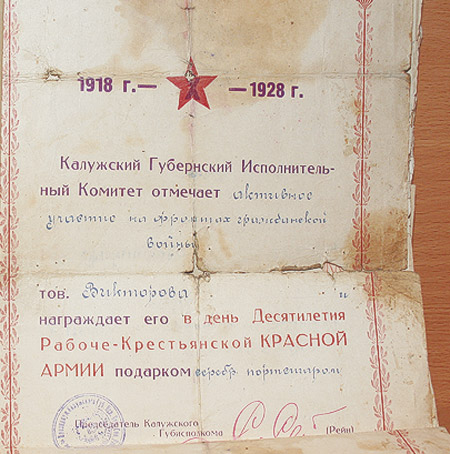 23 февраля 1928 года калужанин Петр Иванович Викторов получил подарок — серебряный портсигар. К подарку прилагалось сопроводительное письмо: «Гражданин Викторов Петр Иванович преданно защищал советскую власть на фронтах гражданской войны, вступив добровольно в ряды Красной армии в 1918 году… В боях против колчаковских банд был ранен».