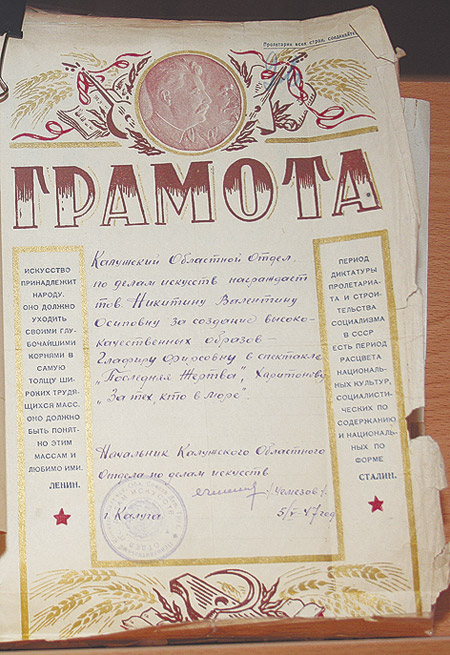 Грамоту с изображением Сталина вручили 5 мая 1947 года известной актрисе нашего драмтеатра Вере Никитиной. Текст грамоты почему-то совершенно неграмотный: «Награждается Никитина Валентина Осиповна за создание высококачественных образов: Глафиру Фирсовну в спектакле «Последняя жертва», Харитонову «За тех, кто в море». Подписал документ начальник Калужского областного отдела по делам искусств Чемизов.