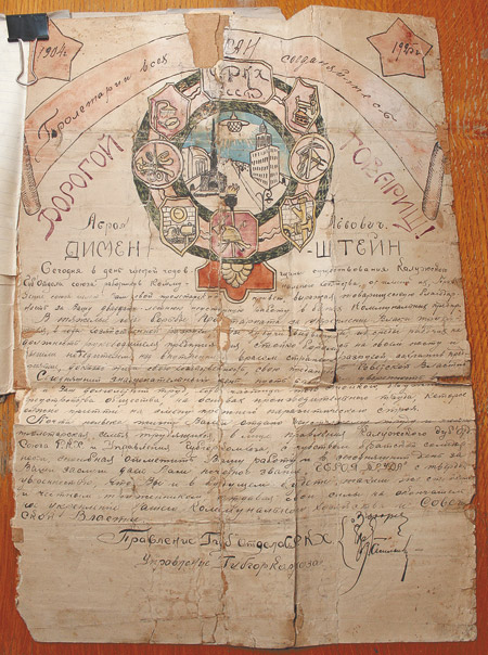 Эта рисованная грамота принадлежит заведующему городской баней Абраму Львовичу Дименштейну. Она была вручена ему в 1925 году. Баня, в которой служил Дименштейн, находилась в Березуйском овраге (ранее это были знаменитые бани Давингоффа). Абрам Львович дослужился до звания героя труда. Документы подтверждают, что заведующий баней участвовал в русско-японской и Первой мировой войнах. И даже имел звание полного георгиевского кавалера «За отличие в боях».