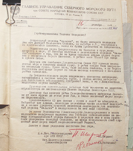 Один из уникальных документов — сообщение о смерти инженера-гидролога Дмитрия Николаевича Соколова. Наш земляк погиб 23 октября 1940 года при крушении ледокола «Малыгин». А справка об этом событии приложена к пенсионному делу его жены — Евдокии Федоровны Соколовой.