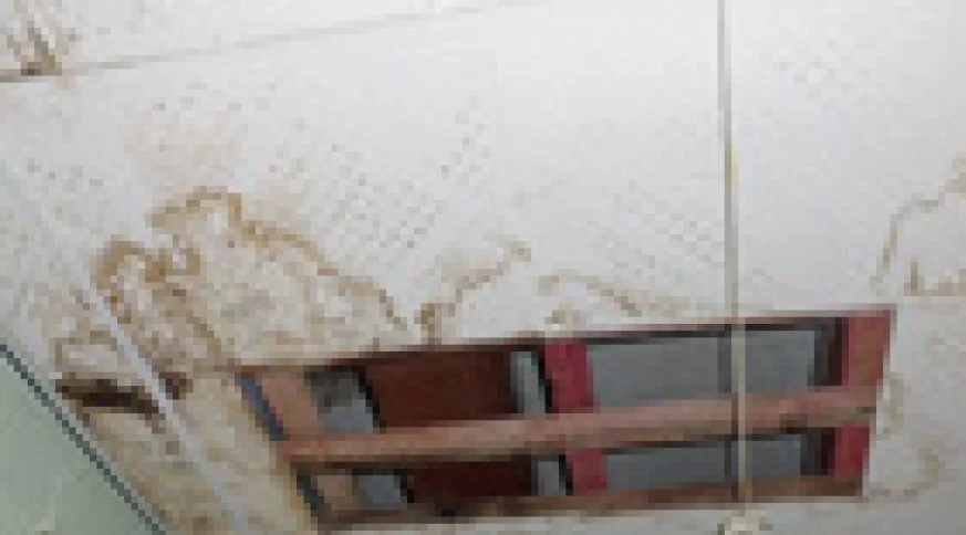 После проливных дождей с потолка второго этажа клочьями свисают плиты, готовые в любой момент упасть на головы.<br>