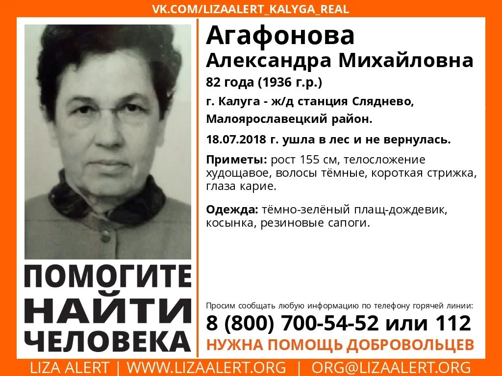 Женщина пропала в районе ж/д станции Сляднево в Малоярославецком районе. Она невысокого роста - 155 см, худощавого телосложения, темноволосая и с короткой стрижкой. Была одета в темно-зеленый плащ-дождевик, резиновые сапоги, косынку.