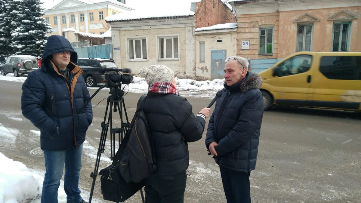 На фото: Доктор Ругин даёт интервью телеканалу после окончания судебного заседания.