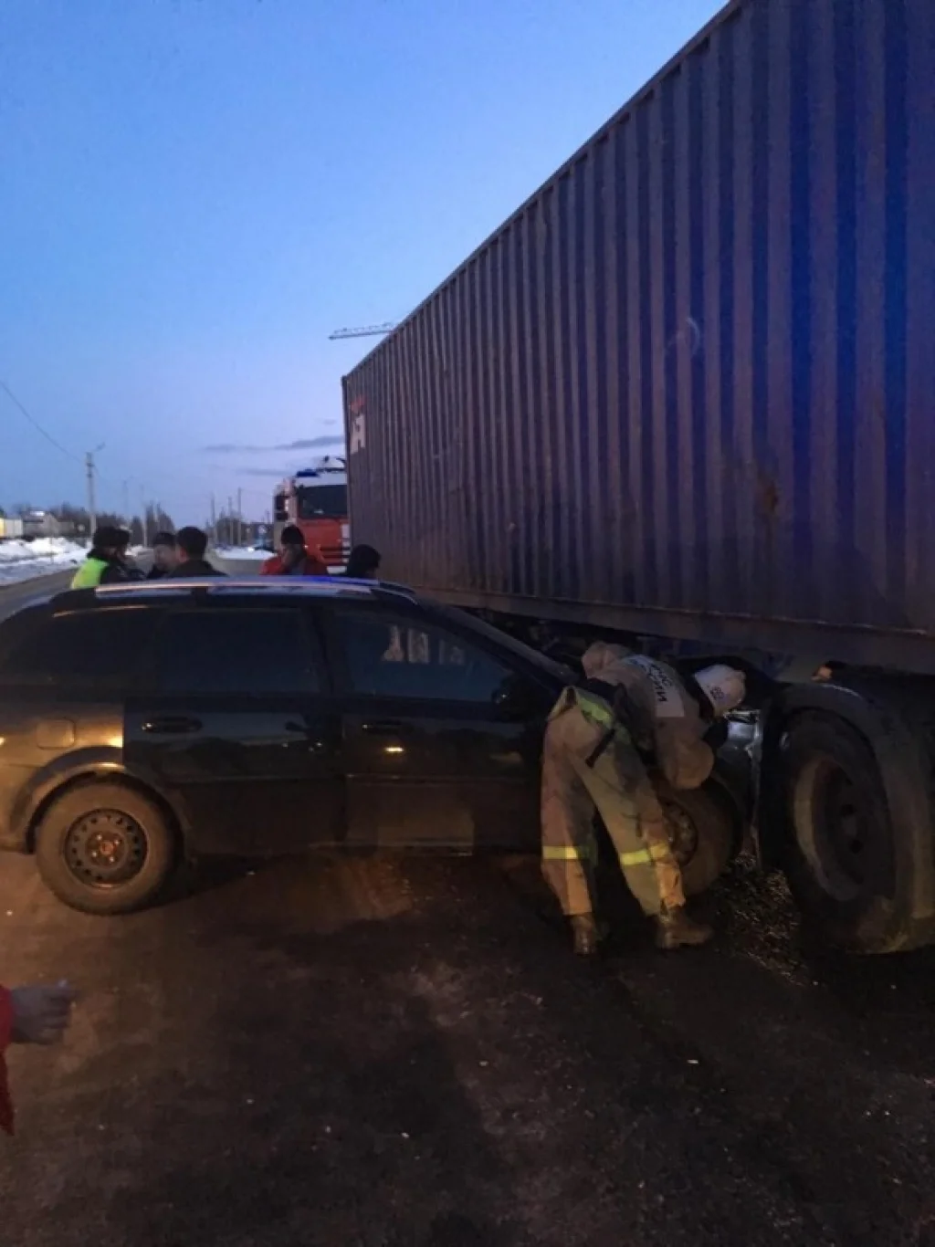 Легковушка врезалась в стоячую на обочине фуру. Судя по оперативным фото, машина врезалась в полуприцеп сбоку. Капот «Шевроле» оказался полностью под фурой.