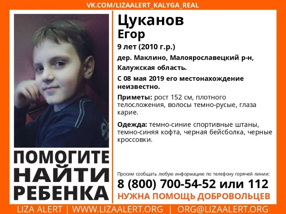 В среду, 8 мая, в деревне Маклино Малоярославецкого районе пропал 9-летний Егор Цуканов, сообщается в официальной группе «Лиза Алерт Калуга».
