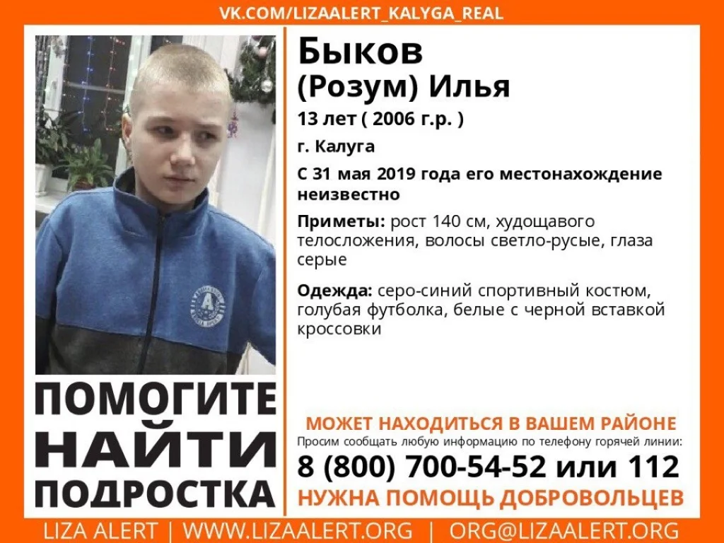13-летнего Илью Быкова (Розума) вновь разыскивают в Калужской области, сообщили в официальной группе «Лиза Алерт Калуга» во вторник, 4 июня.