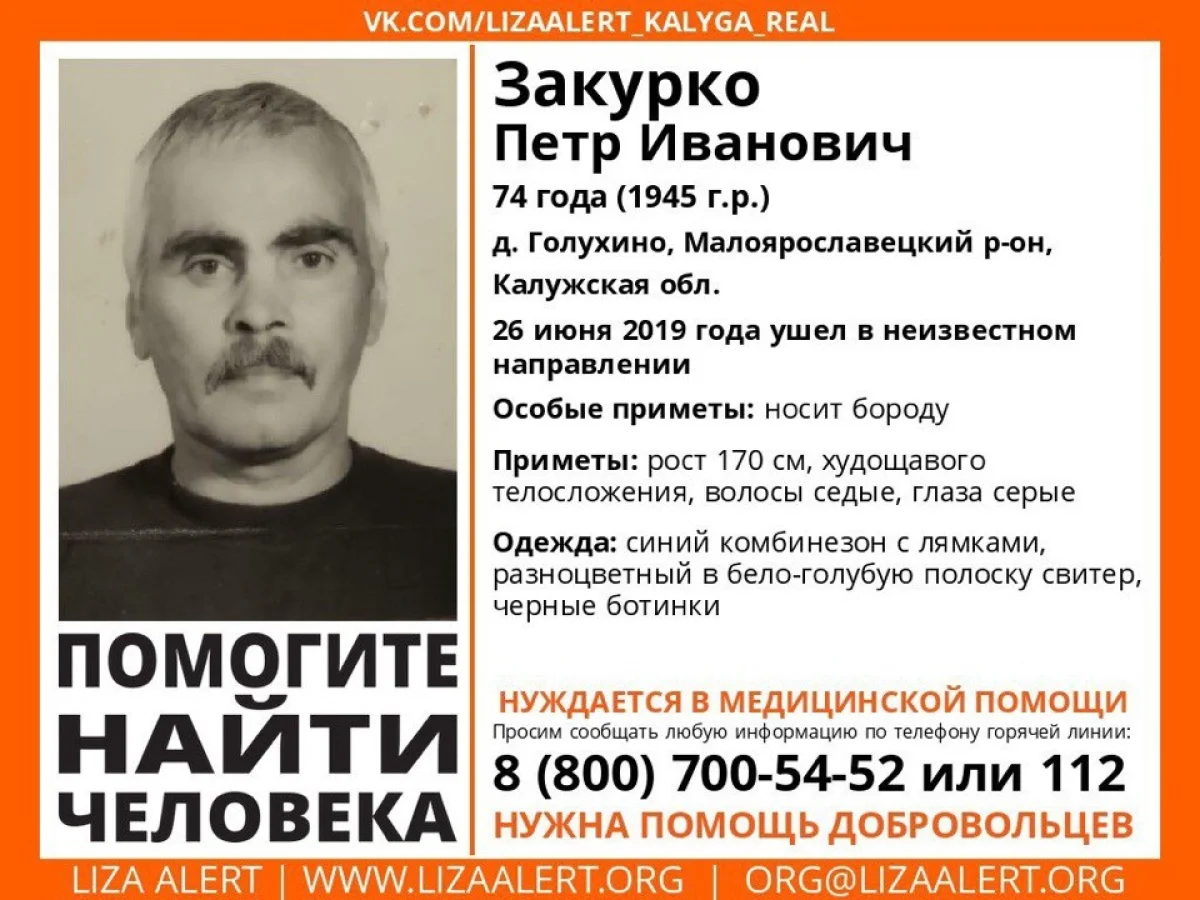В деревне Голухино Малоярославецкого района пропал 74-летний мужчина. Информацию о розыске разместил на своем сайте добровольный поисковый отряд «Лиза Алерт» 27 июня. Пенсионер вышел из дома вчера вечером и не вернулся. Нуждается в медицинской помощи.