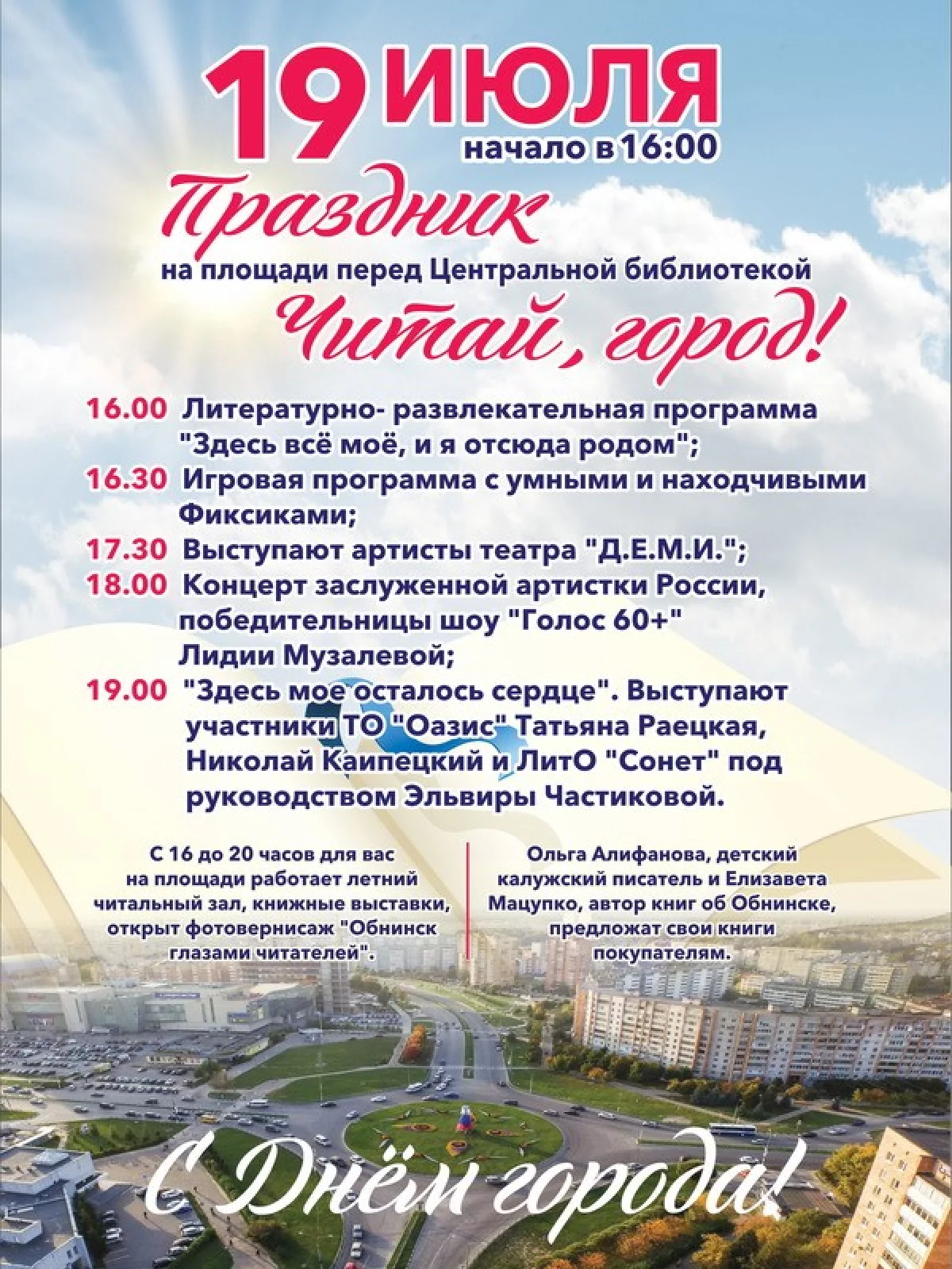 Сегодня в Обнинске на площади перед Центральной библиотекой ( ул.Энгельса, 14) пройдут мероприятия, пириуроченные ко Дню города. Программу праздника «Читай, город!» опубликовали на сайте администрации наукограда 19 июля.
