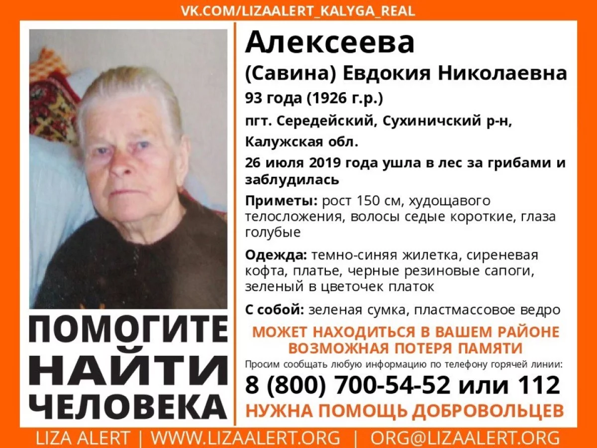 В Сухиничском районе пропала 93-летняя пенсионерка. Об этом сообщает добровольный поисково-спасательный отряд "Лиза Алерт" 27 июля. Женщина ушла за грибами из дома в поселке городского типа Середейский 26 июля и не вернулась.