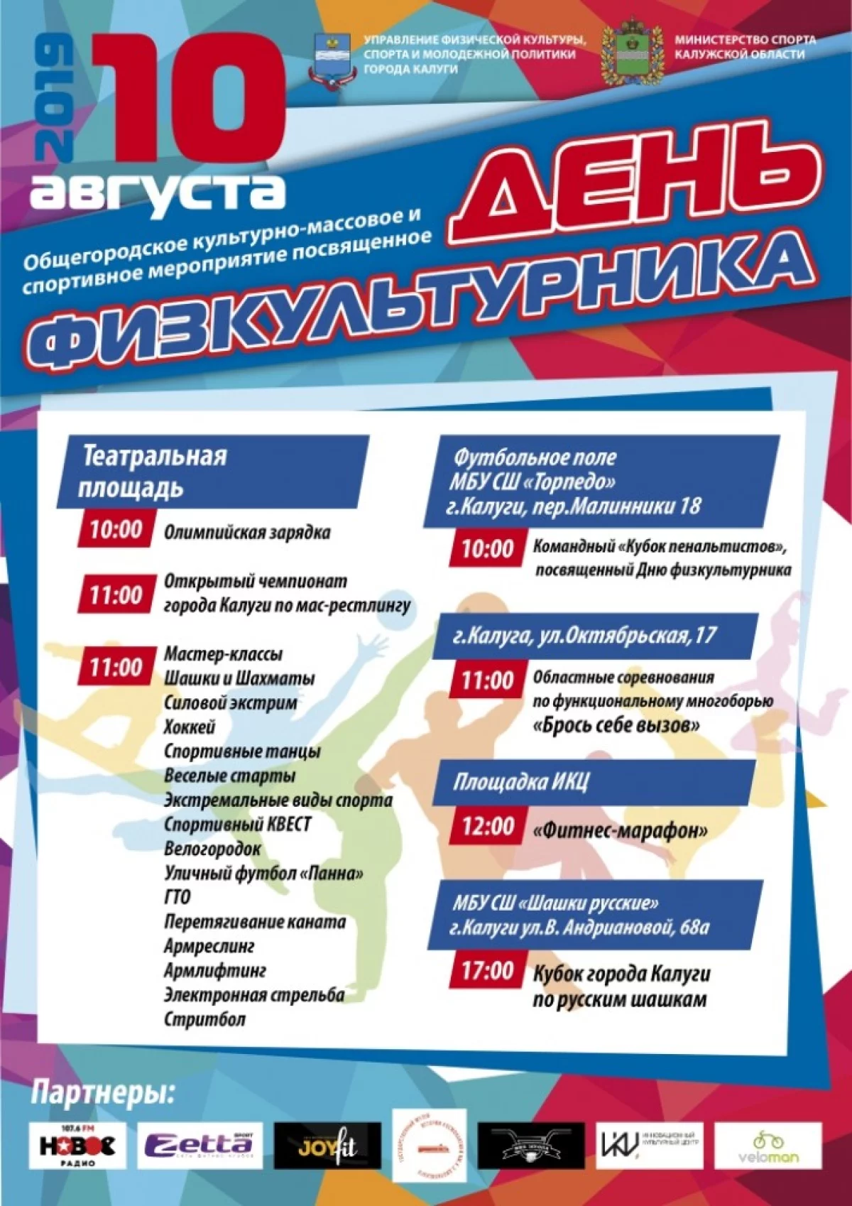 В День физкультурника, который пройдет в Калуге 10 августа, пройдет множество спортивных и культурных мероприятий, сообщается на сайте городской управы.