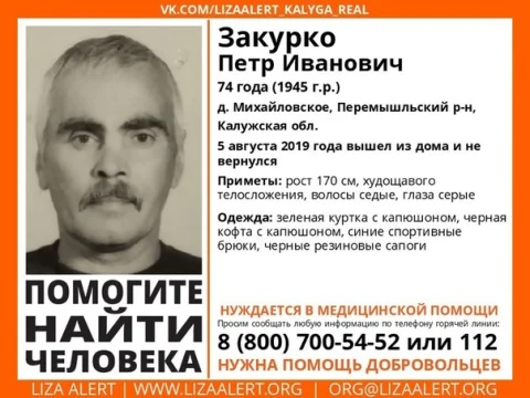 74-летний Петр Закурко пропал в Перемышльском районе 5 августа, сообщается в официальной группе добровольного поискового отряда «Лиза Алерт». Сбор волонтеров, желающих присоединиться к поиску, был организован этой ночью в деревне Михайловское.
