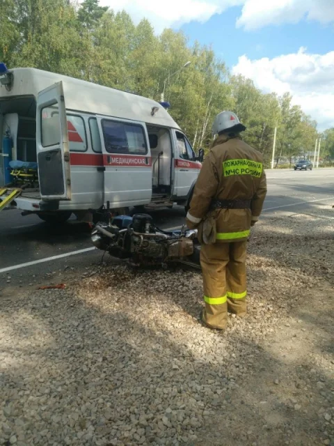 Мотоцикл перевернулся, в результате ДТП есть пострадавщий. На месте ему оказывали помощь сотрудники скорой помощи, госавтоинспекторы и спасатели МЧС: всего 9 человек и 3 единицы техники.