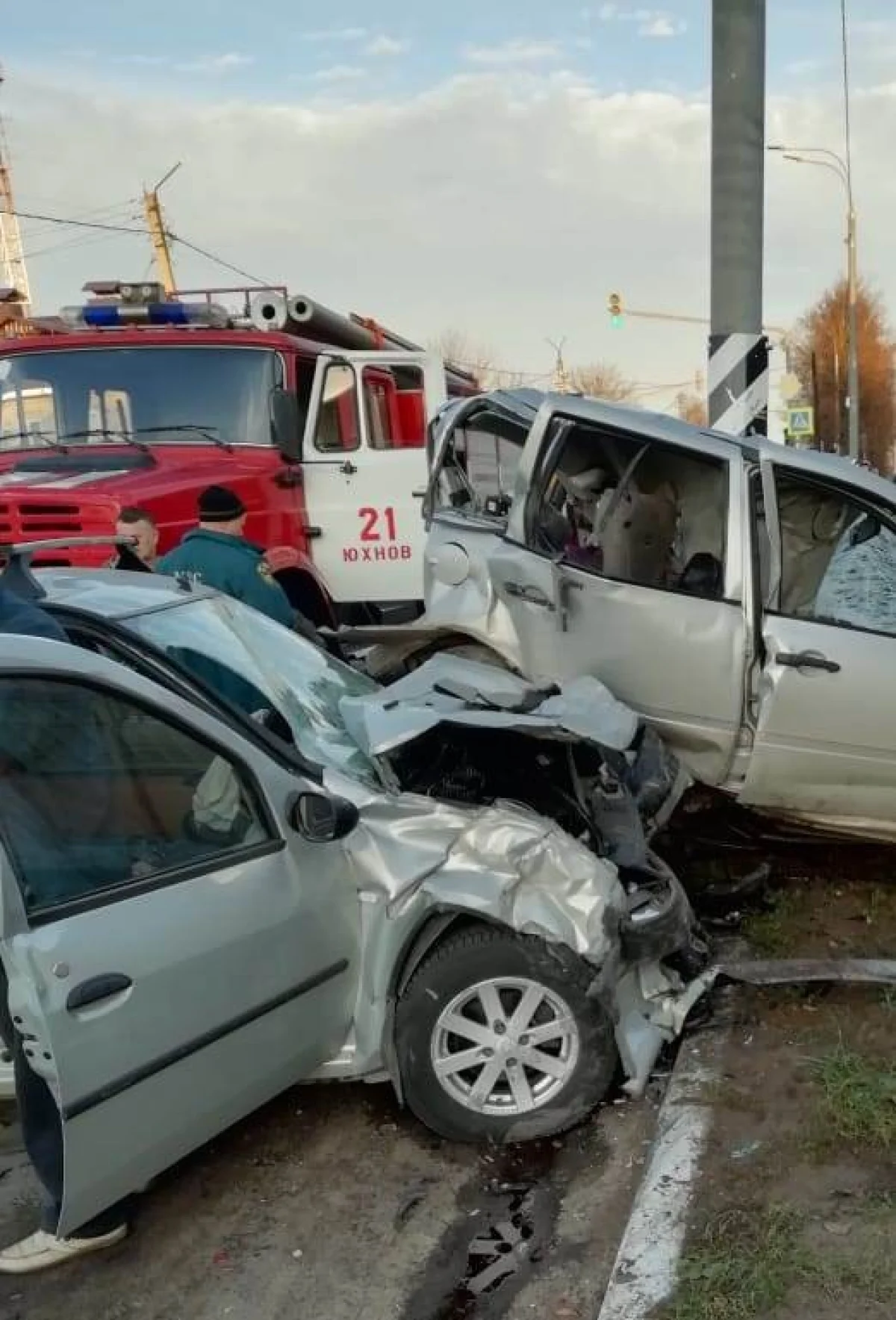 В Юхнове на улице Энгельса столкнулись два автомобиля: «Лада Калина» и «Рено Логан», после чего отечественная легковушка врезалась в столб.