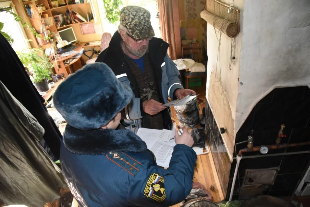 Спасатели инструктируют домовладельцев как действовать в чрезвычайных ситуациях и раздают листовки о мерах пожарной безопасности.