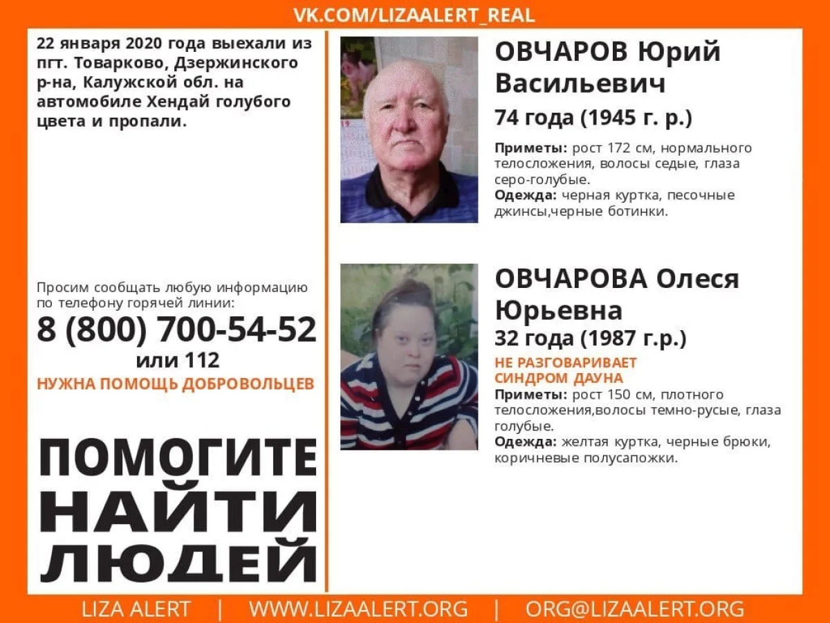 Добровольный поисковый отряд «Лиза Алерт» сообщил о поиске двух жителей поселка Товарково: 74-летнего Юрия Овчарова и его 32-летней дочери Олеси Овчаровой.