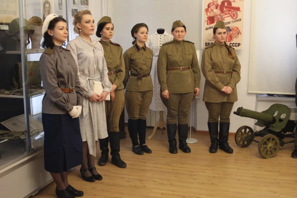 В экспозиции собраны предметы из фондов музея и частных коллекций: медицинские принадлежности, вещи, принадлежавшие женщинам подполья и труженицам тыла, комплекты военной формы и другое.