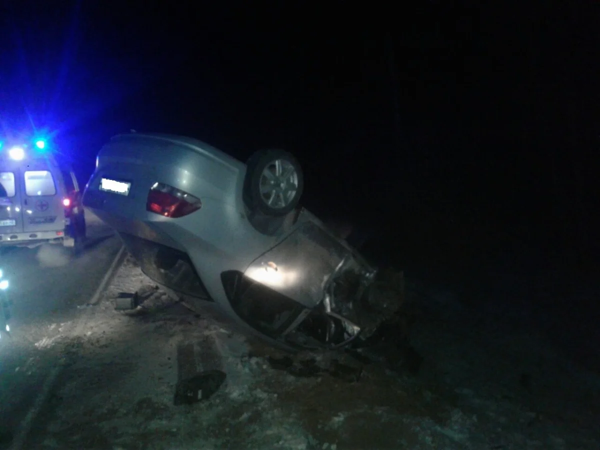 «Фольксваген Поло» столкнулся с «КамАЗом», после чего легковушка перевернулась, а грузовик съехал в кювет.
