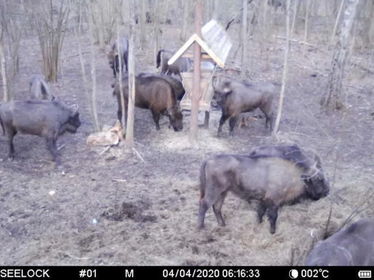 Данные фотоловушек подтверждают, что недавно выпущенные из вольера для передержки зубры влились в крупное стадо, обитающее неподалеку от вольера, и теперь звери часто приходят к кормушкам все вместе.