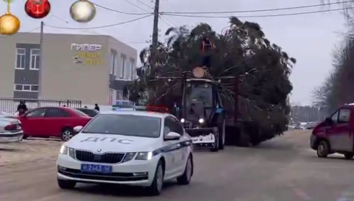 В пятницу, 8 декабря. администрация Людиновского района показала, как в Людиново везут огромную елку. Ее по дороге тащил трактор.