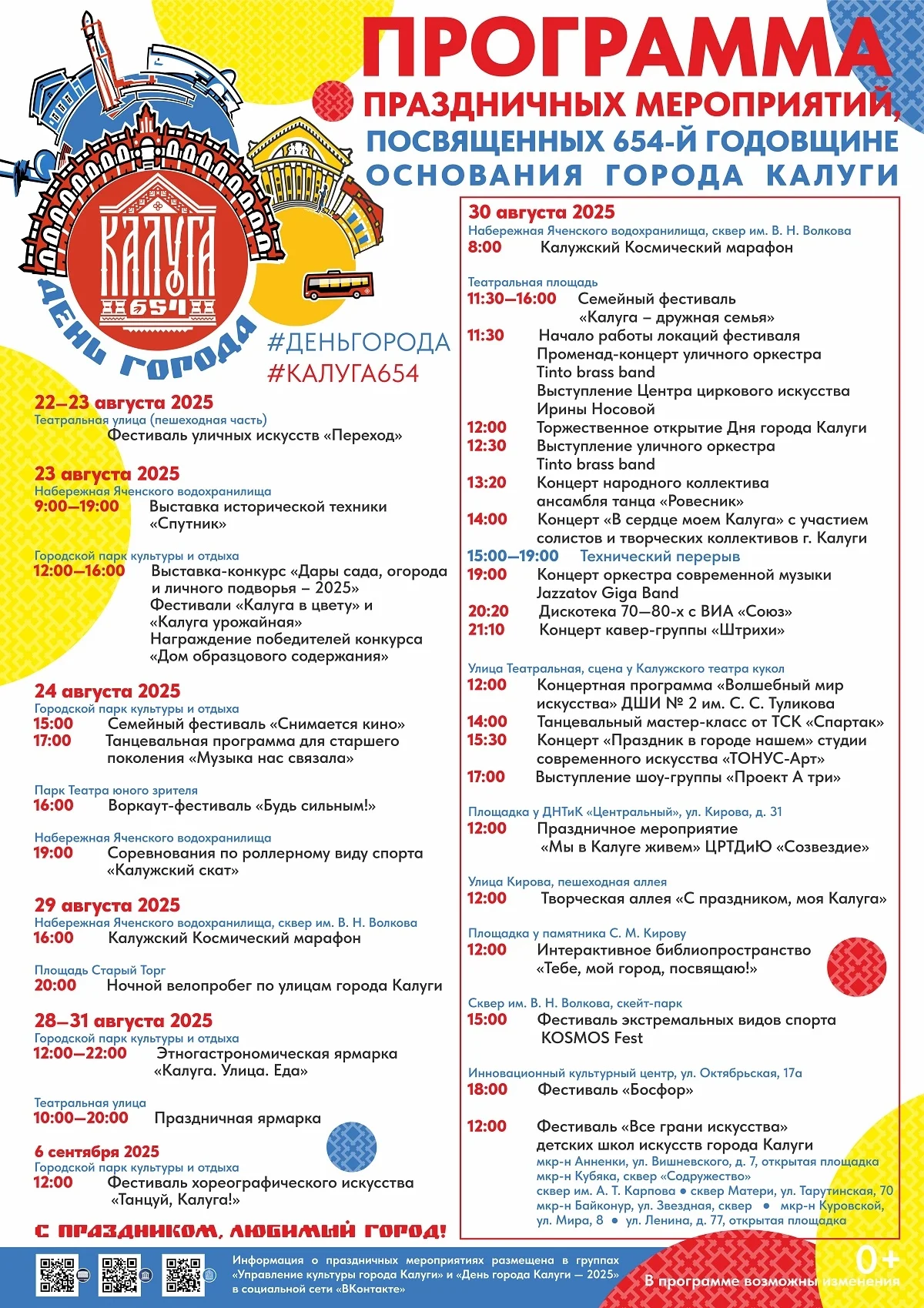 Торжества в честь 654-летия Калуги стартовали уже 22 августа фестивалем «Переход». Народные гуляния развернутся на всех главных площадках города.