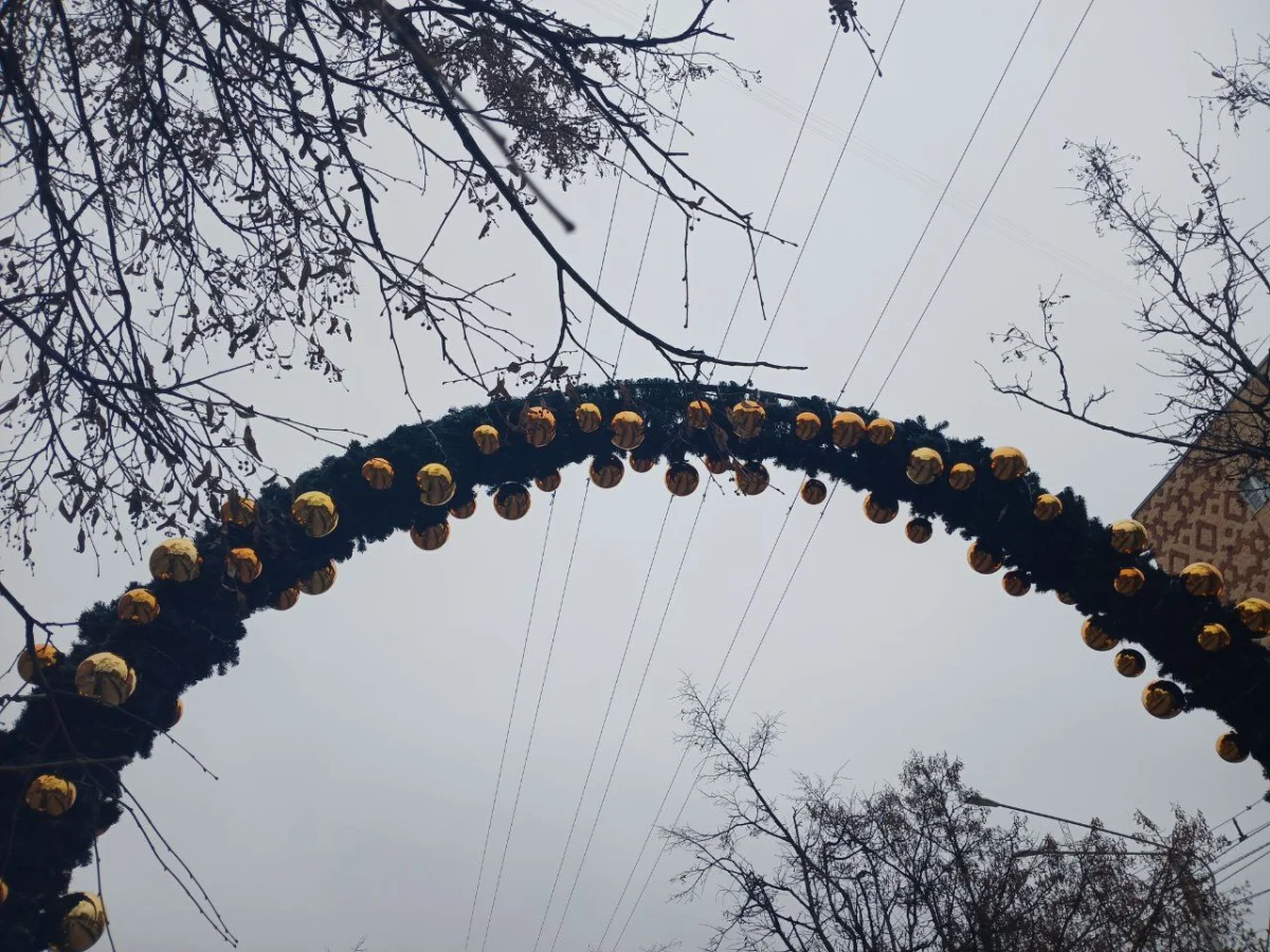 Арки украшены еловыми ветками и золотыми шарами.