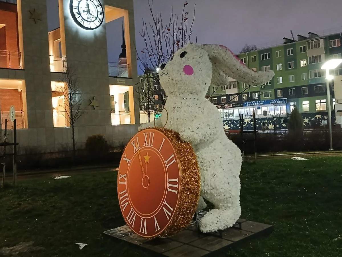 У большого белого зайца есть часы, которые показывают без пяти минут полночь.