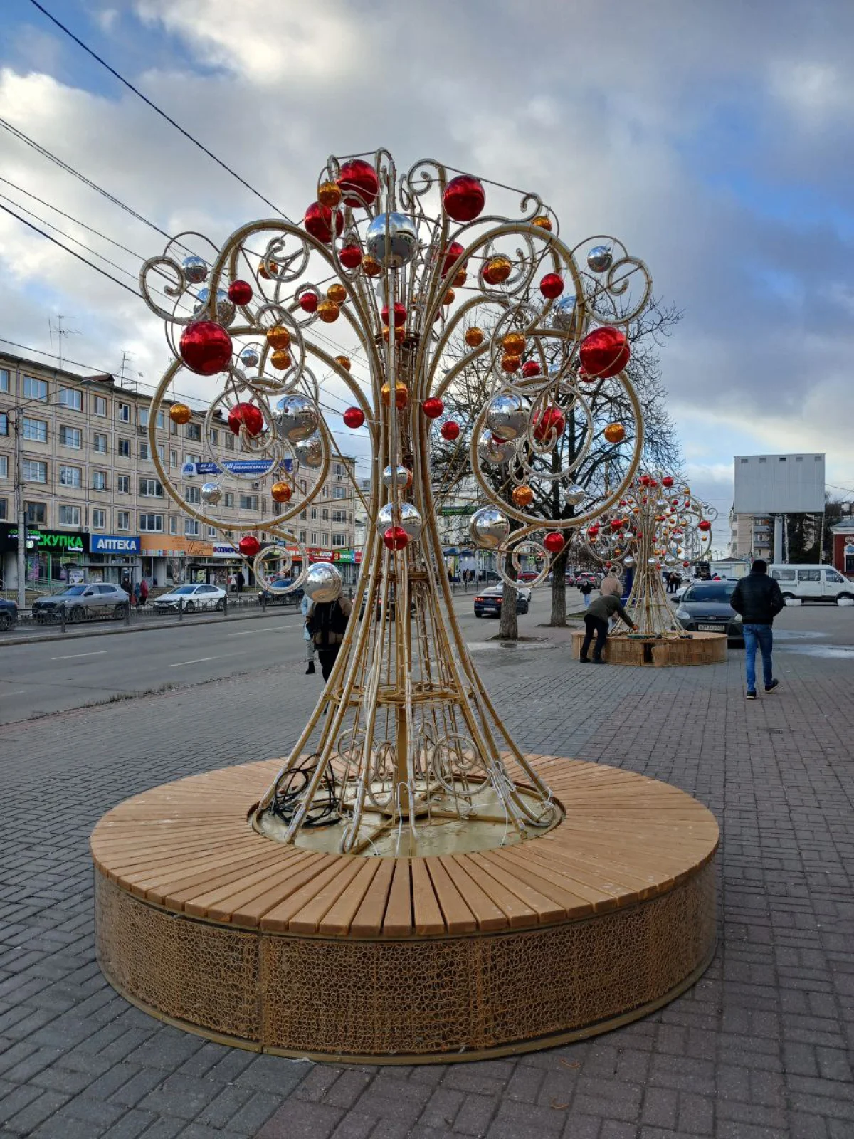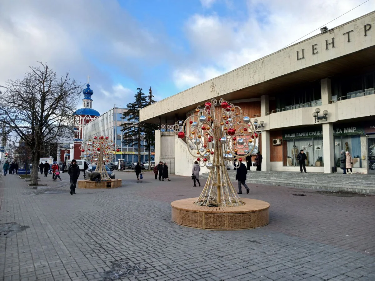 В субботу, 13 декабря, новогодние деревья с шарами установили на тротуаре возле кинотеатра «Центральный».