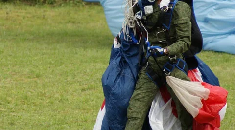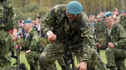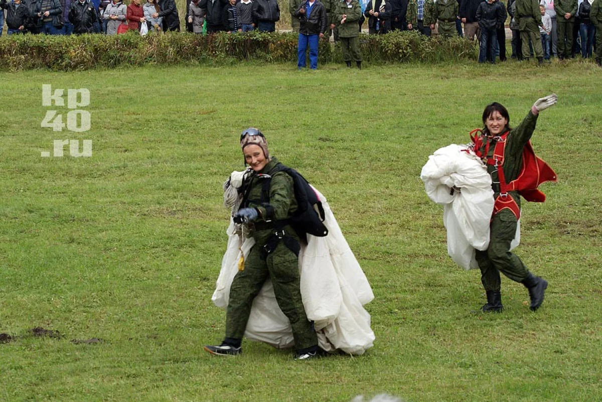 Разведчики ВДВ десантировались с помощью парашютов «Арбалет-2» и на специальных тросах с вертолетов. Приземлившись, они немедленно вступили в показательный бой.