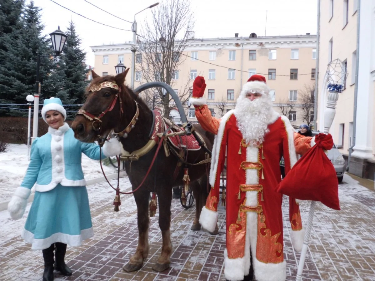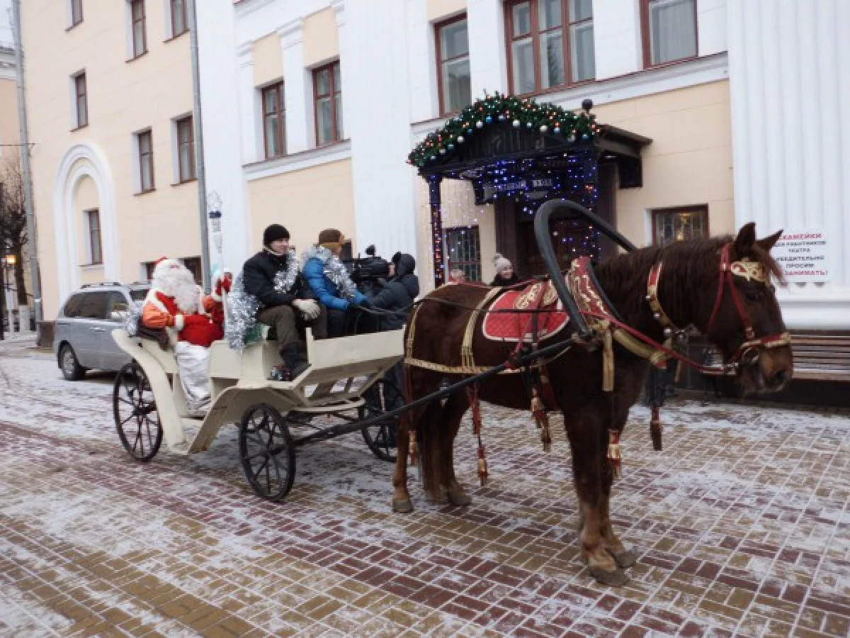 В субботу, 21 декабря, Дед Мороз со Снегурочкой проехали по центральным калужским улицам на фаэтоне. В коляску впрягли всего одного коня по кличке Огонек.