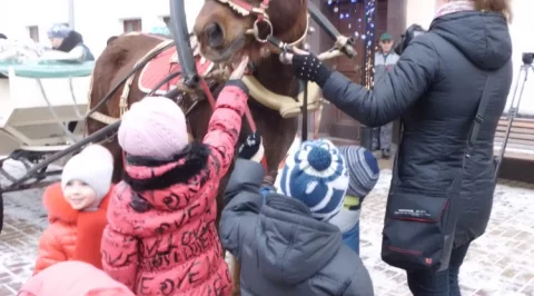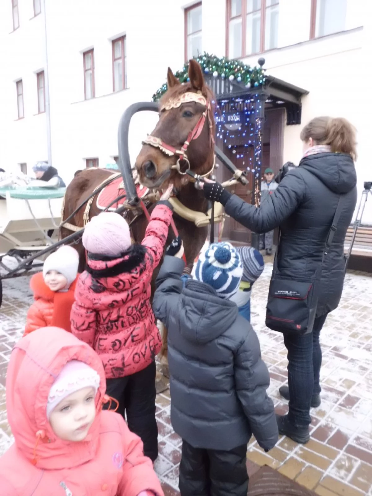 Пока главные новогодние персонажи усаживались в коляску, детвора облепила Огонька. Коню такое внимание явно льстило, малыши смогли и погладить его, и сфотографироваться на память.