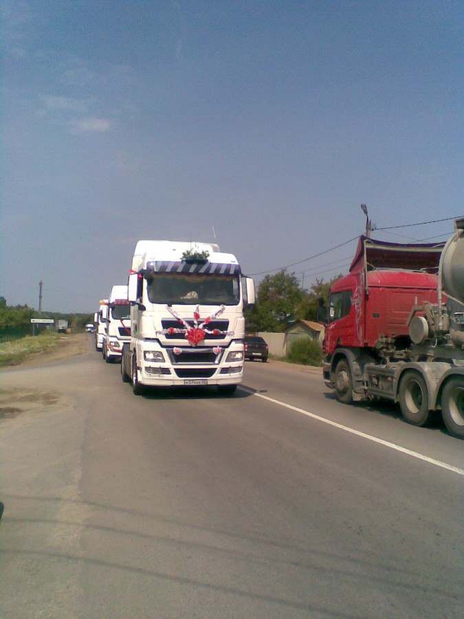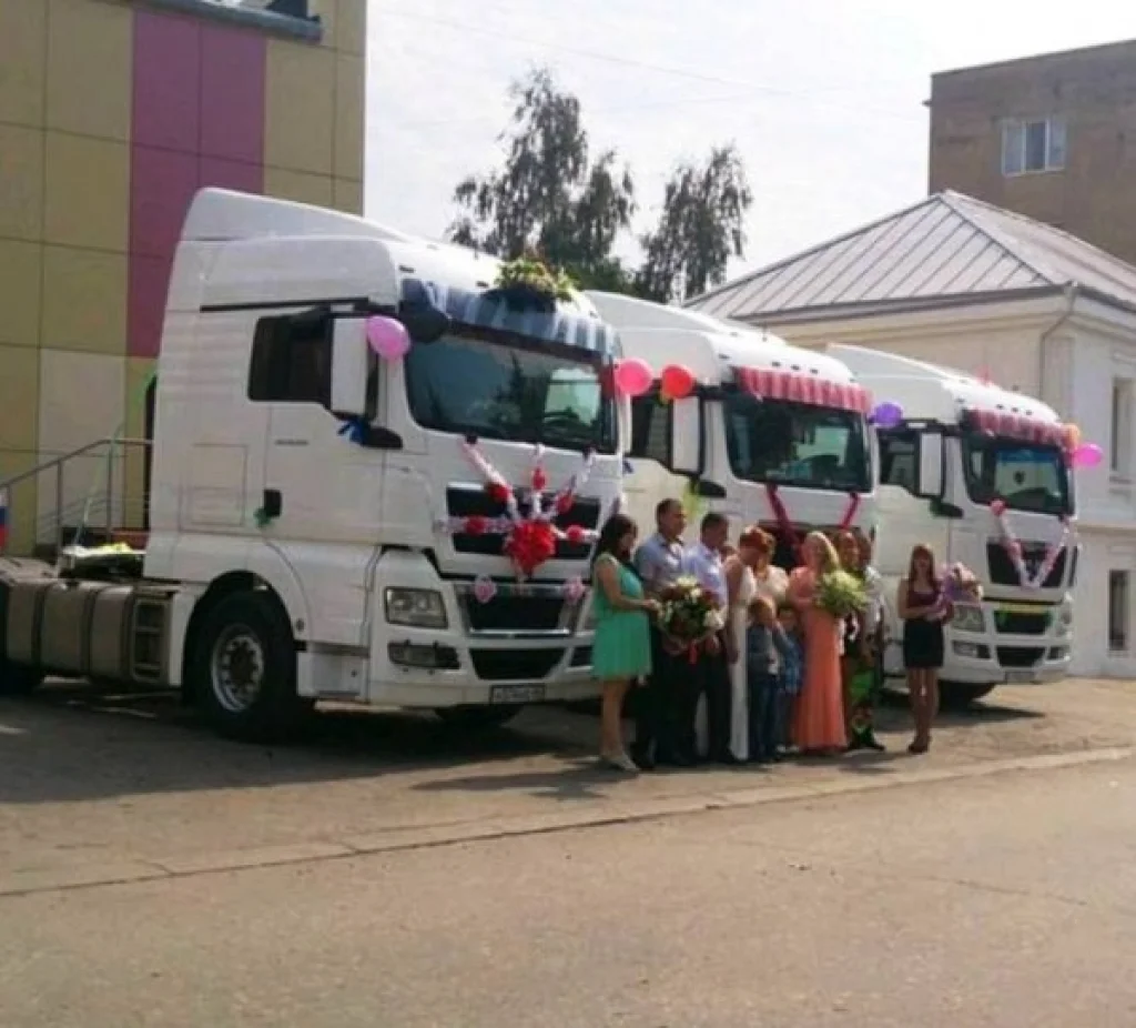 В субботу, 12 июля, в Калуге прошла необычная свадьба – «свадьба дальнобойщика», как ее успели окрестить в социальных сетях. Кортеж из трех МАНов тут же приковал внимание пешеходов и водителей.